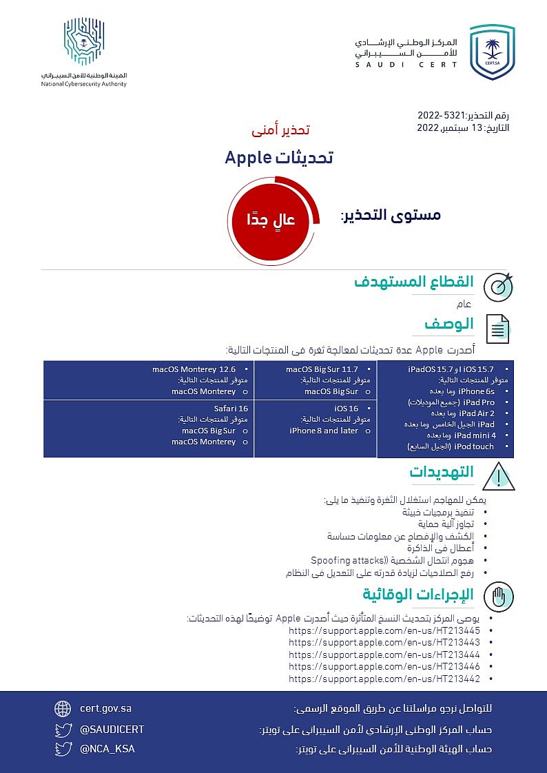 تفصيلاً، بيّن المركز أن مستوى الخطورة للتحذير عالٍ جدًا وأنه يستهدف كل القطاعات، موضحاً أن أبل أصدرت تحديثات لمعالجة الثغرة.